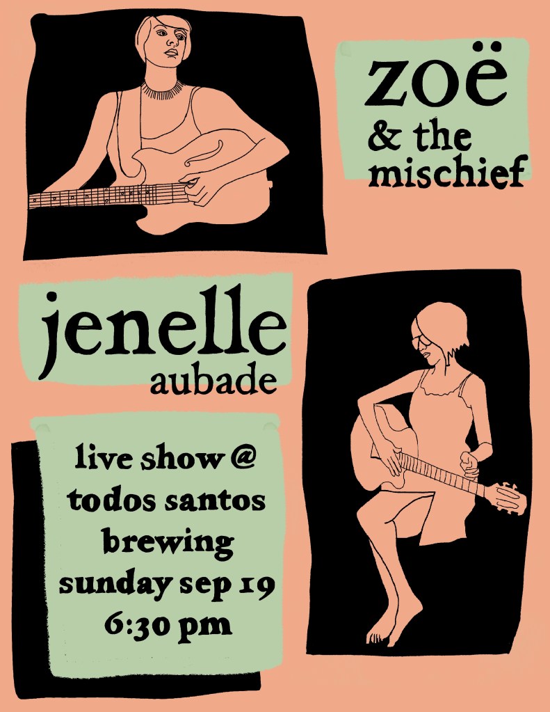 Enjoy an evening of fresh live music and craft beers in garden at Todos Santos Brewing during this Sunday Session with Zoe Dearborn, Lucas Bennett, and Jenelle Aubade.