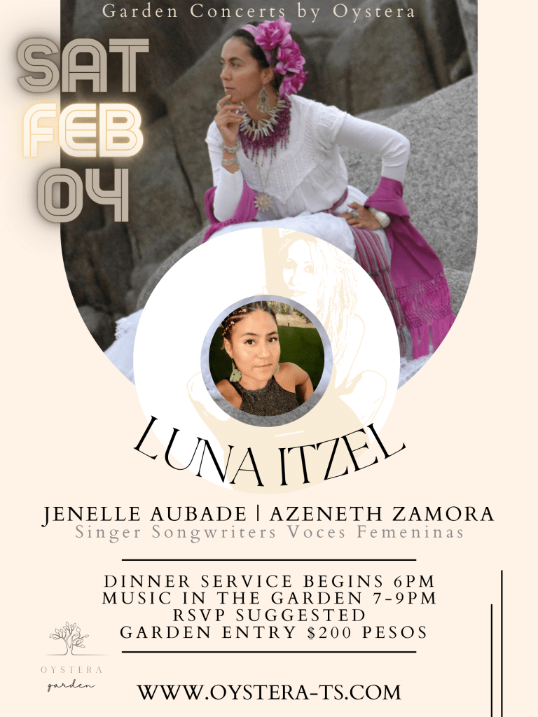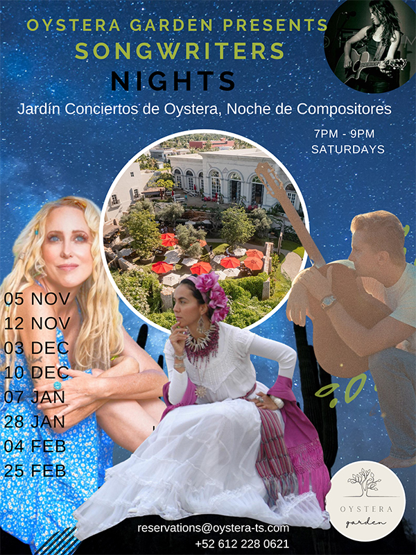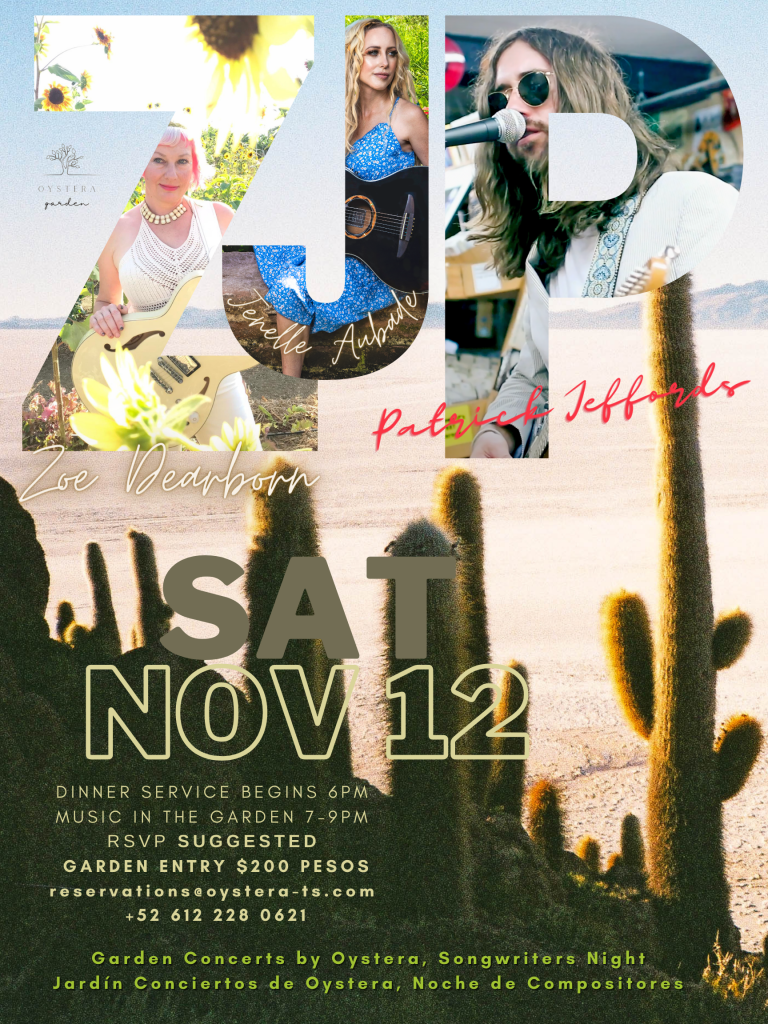 Tim Lang and I are curating a fun, eclectic, and inspired selection of musical and spoken word acts to present to our community, all originals, presented under the Baja starlight in a magical garden setting. Both restaurants will be open for the events, Oystera Seafood, and Oystera Garden Farm to Table, with different drink specials for each event. Dinner starts at 6pm with music in the garden at 7pm. Garden entry is 200MXN and RSVP can be made to secure the best close up tables and experience.