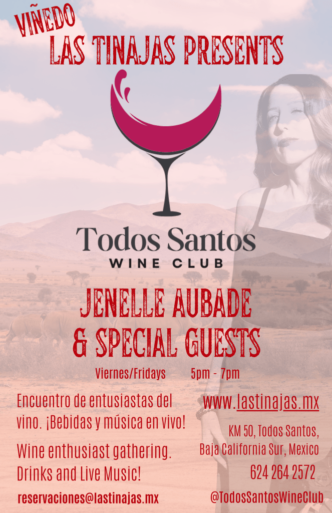 Join Todos Santos Wine Club at the vineyard of Las Tinajas Friday May 23 5-7pm for sunset cheers, tapas, and live music. Klaudya Vega & Jenelle Aubade, with Dylan Lorenzo and Steven Guerrero – originals and tributes.