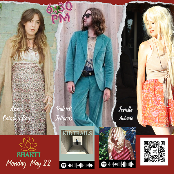 Bohemian night at Shakti! This Monday enjoy delicious Buddha Bowls and drinks to music by original artists Jenelle Aubade, Patrick Jeffords, and Annie Rainsley-Ray, and friends.